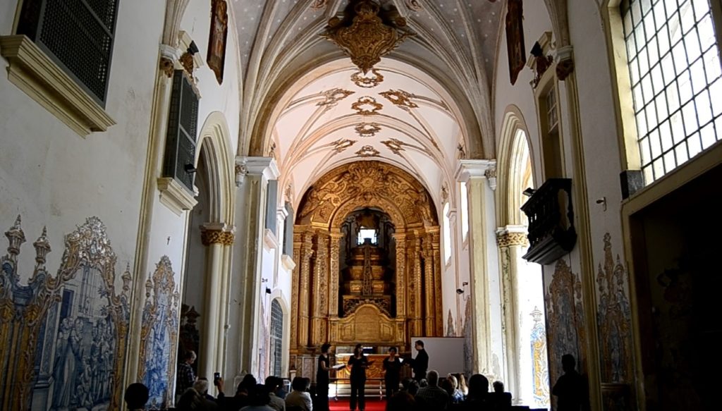 Foto da actuação do Ensemble Eborensis, no passado dia 19 de Setembro, antecedendo a conferência de encerramento da III Residência Cisterciense S. Bento de Cástris, que decorreu neste mosteiro de 17 a 19 de Setembro. Nesta actuação o ensemble fez o programa Lumen ad revelationem, composto por cantochão proveniente das fontes do mosteiro e polifonia de compositores da Sé de Évora, com associação à luz.
