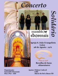 O Ensemble Eborensis irá realizar no próximo dia 28 de Agosto um concerto solidário em colaboração com a Associação de Solidariedade Social Pão e Paz, para quem reverte a receita deste concerto. A entrada tem o custo de um (ou mais) género alimentício, que reverterá a favor da Pão e Paz.